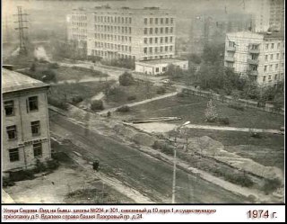 На архивном снимке — вид на бывшие школы № 294 и № 301. Спокойный район, знакомая застройка и атмосфера 70-х годов — таким многие помнят этот уголок города.